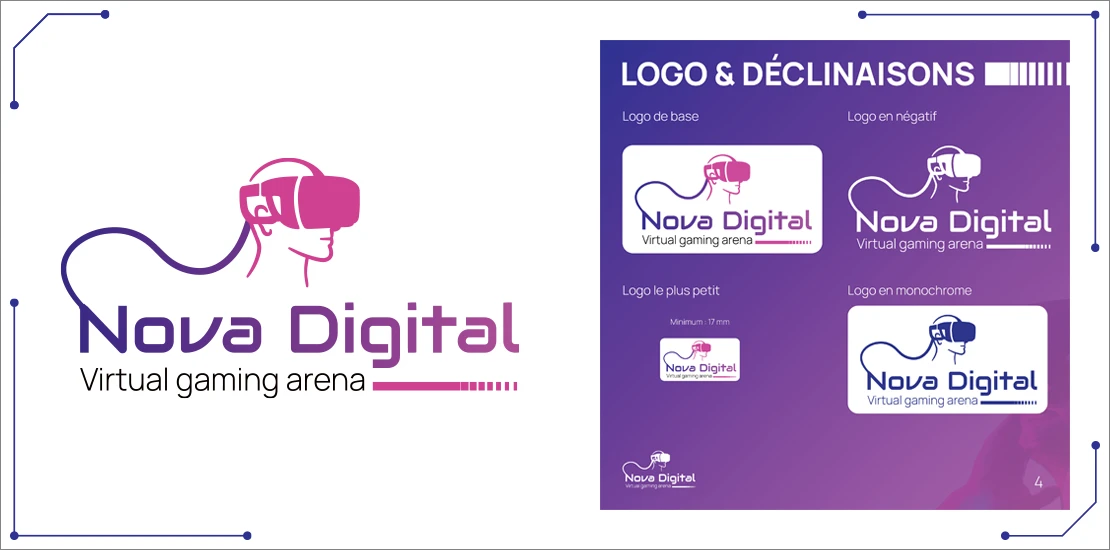 Après plusieurs recherches graphiques du logo évoquant le jeu vidéo ou l’arène de jeu ou le jeu vidéo en réalité virtuelle, création finale du logo. Sur le slide 4 je montre d’autres recherches du logo.
