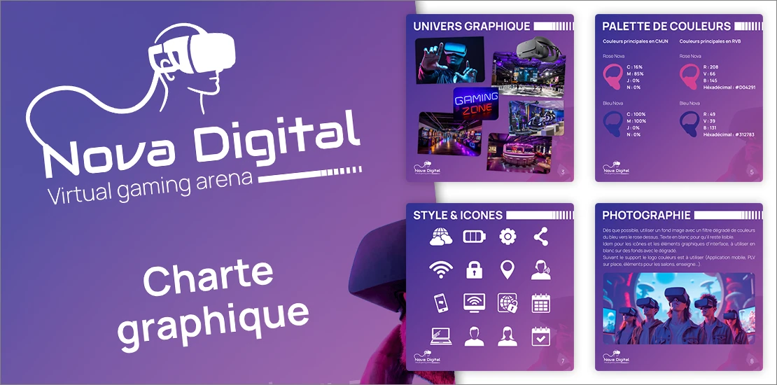 Créer le logo, la charte graphique et une affiche abris bus pour Nova Digital, l’idée générale : des mondes extraordinaires où amusement et innovation se rencontrent.