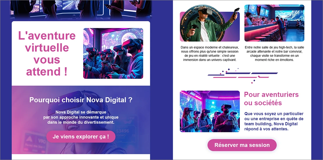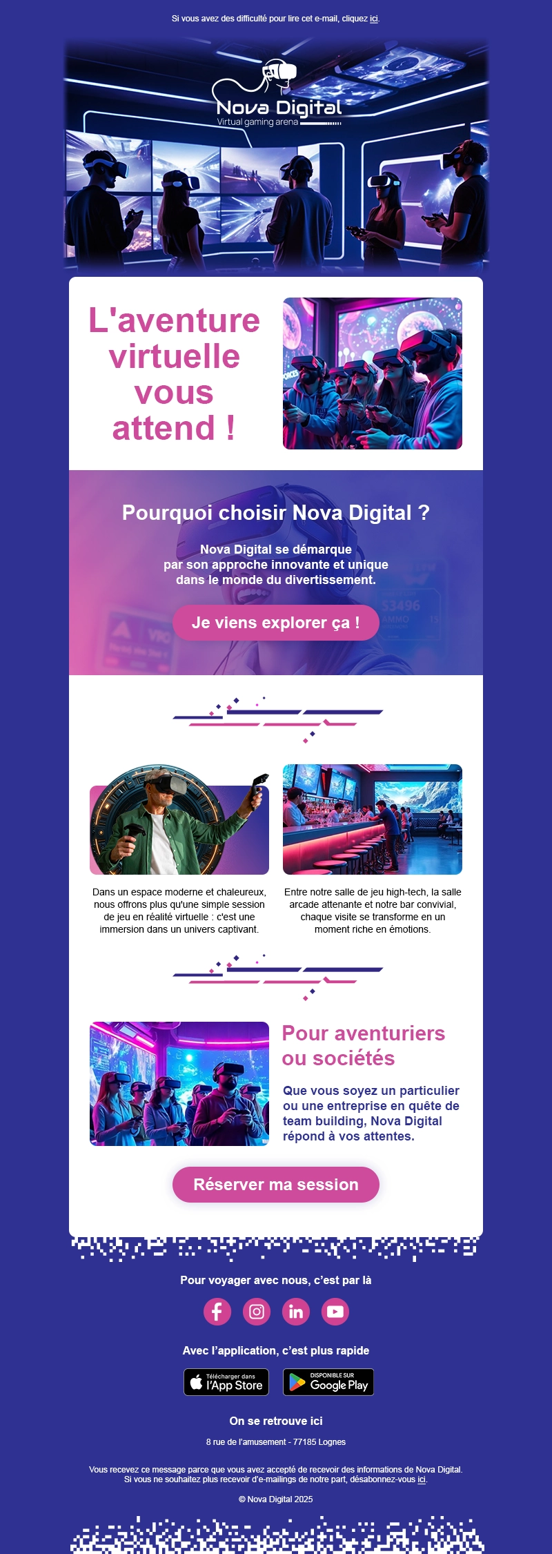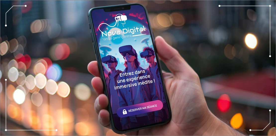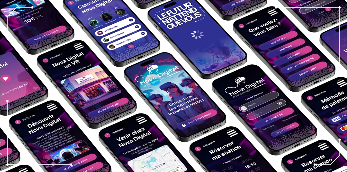 A l’aide du logo, de la charte graphique et de l’ensemble des éléments graphiques de la marque, créer l’application mobile permettant aux futurs clients de réserver une séance de jeu ou bien de s’informer sur la société. Proposer, également, deux gabarits d’e-mailing qui serviront aux campagnes publicitaires de Nova Digital.