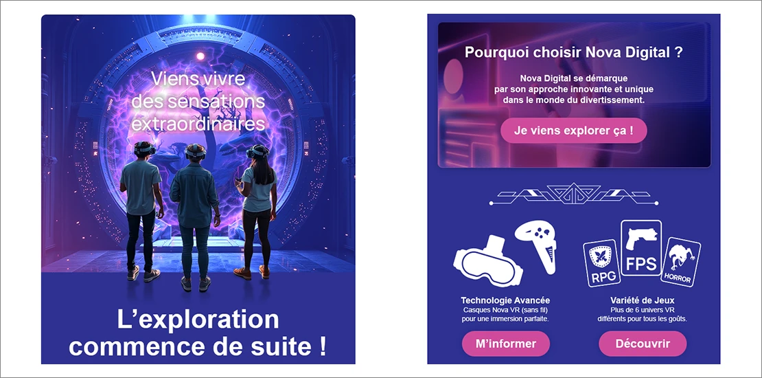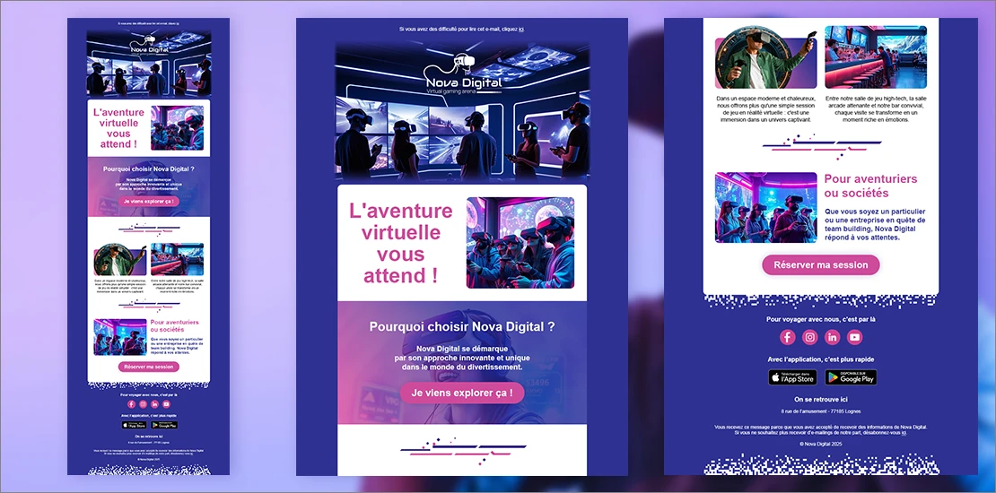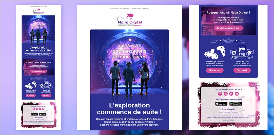 En utilisant l’univers visuel et graphique de Nova Digital, présentation de deux maquettes d’e-mailing.