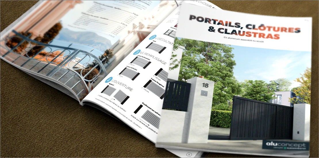 – Création du catalogue 76 pages Portails aluminium soudé et assemblé d’Aluconcept