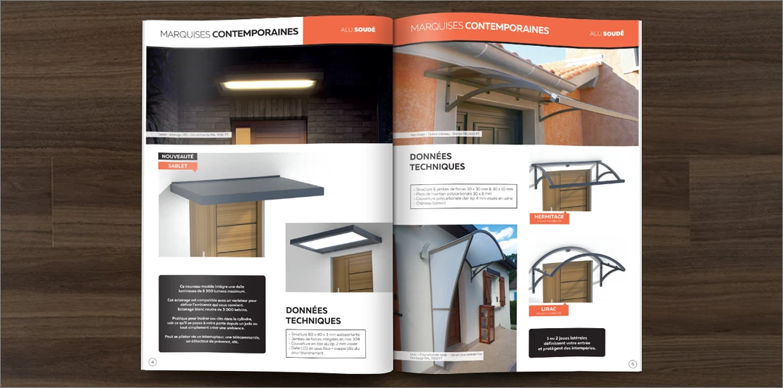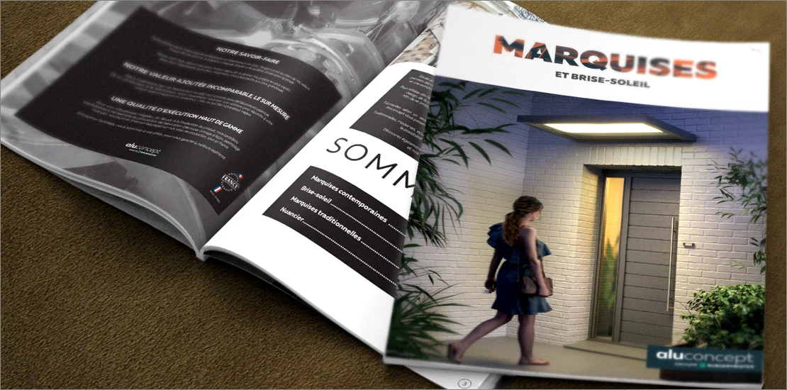 – Création de la brochure 16 pages Marquises/Brise-soleil d’Aluconcept