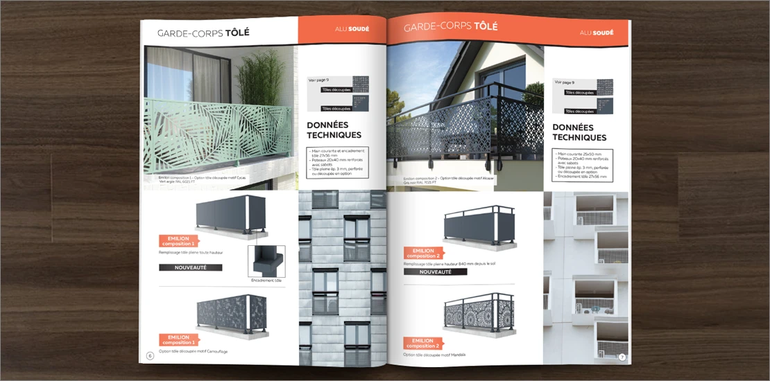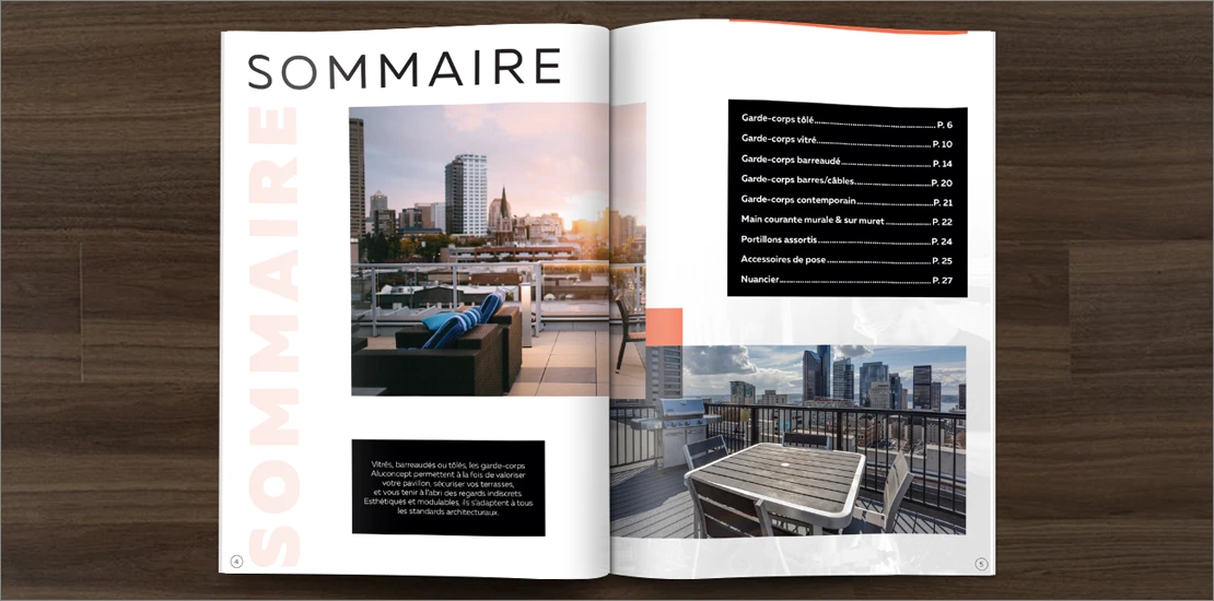 – Création de la brochure 28 pages Garde-corps aluminium soudé, assemblé, vitré ou inox d’Aluconcept