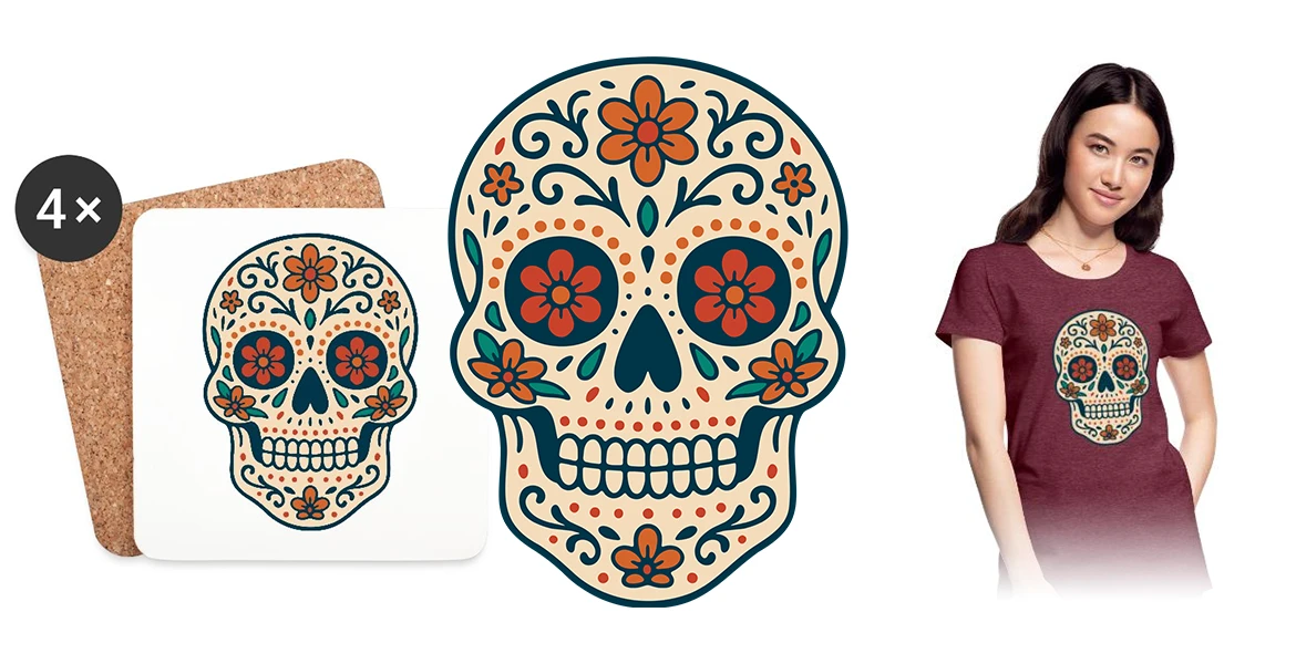 – Création du motif « Crâne Folklore Latino» généré avec l’IA, redessiné et modifié avec Illustrator, Inspiré du folklore d’Amérique Latine