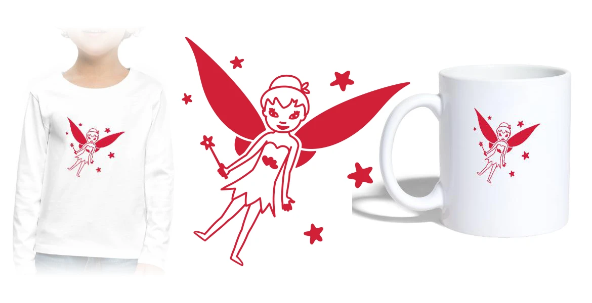 – Création du motif « Fée » en 1 couleur adapté pour les supports : T-shirt, débardeur, polo, sweat, accessoires (casquette, coque mobile, sac banane…), mug