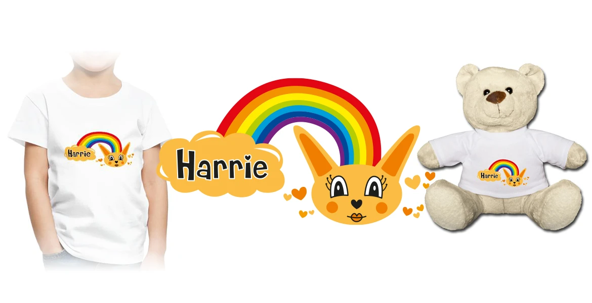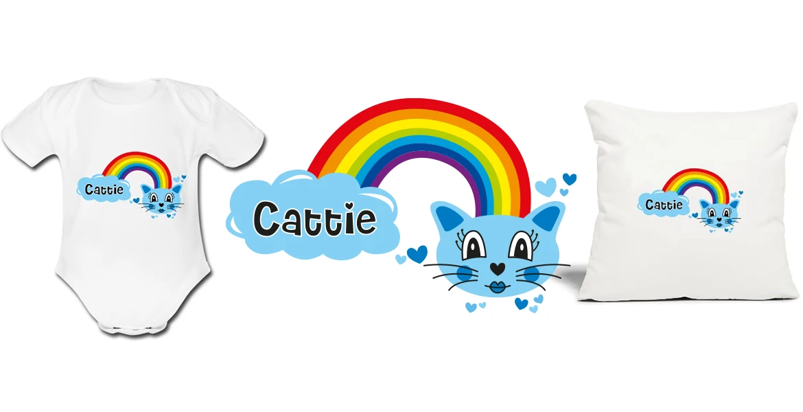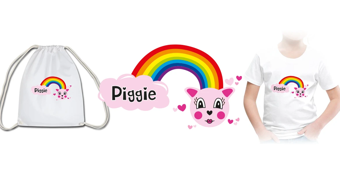 – Création de 3 motifs Mascotte “Cattie, Piggie et Harrie” pour enfant : barboteuse, body, mug, sac à dos en tissu, petit oreiller, thermos