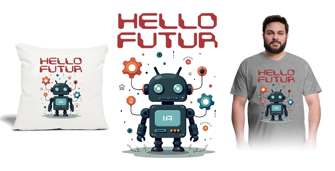 – Création du motif « Hello Futur » généré avec l’IA, retouches sur Photoshop, petit clin d’œil au “Hello World” que tous les geeks connaissent