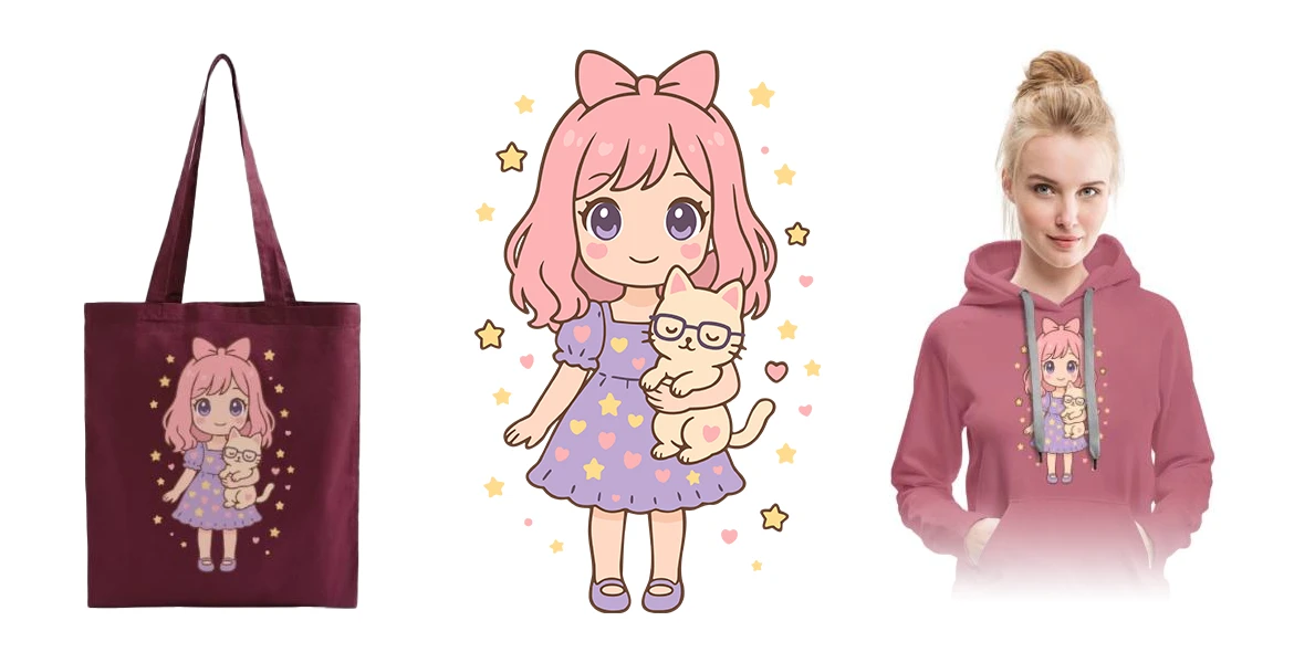 – Création du motif « Petit fille avec chat mignon » généré avec l’IA, redessiné et modifié sur Illustrator