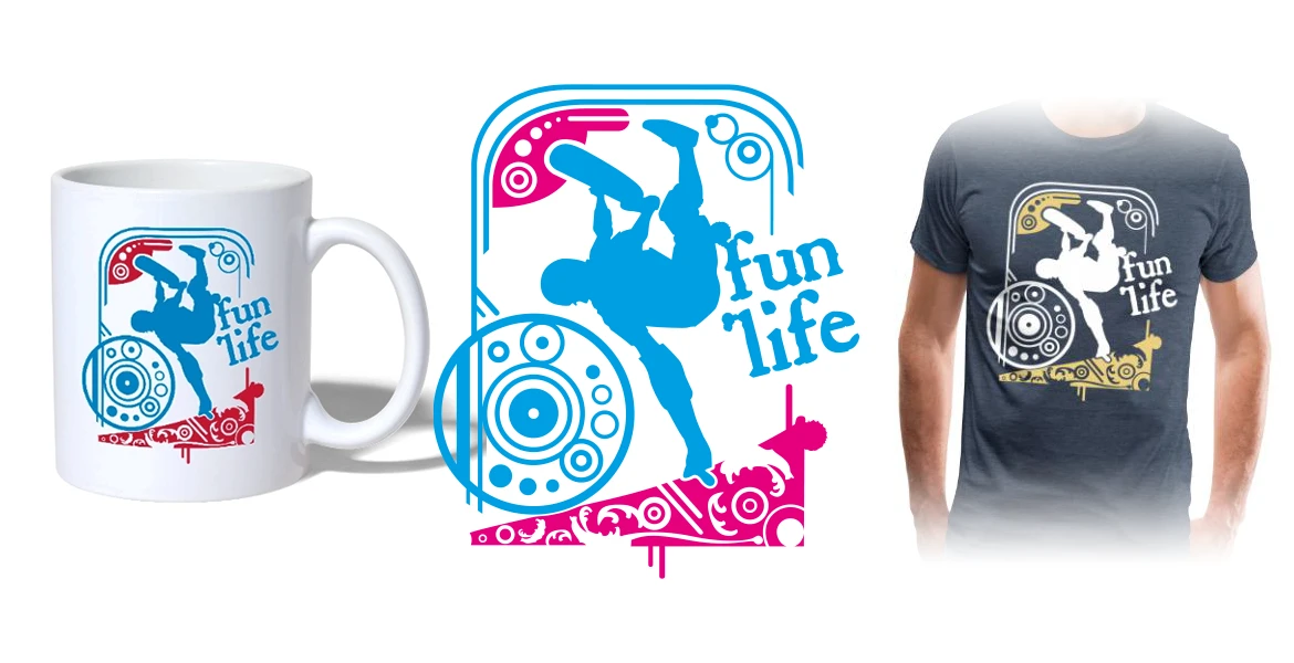– Création du motif « Skate » mélange de traits illustratif et d’arabesques en 2 couleurs adapté pour les supports : T-shirt, débardeur, polo, sweat, accessoires, mug