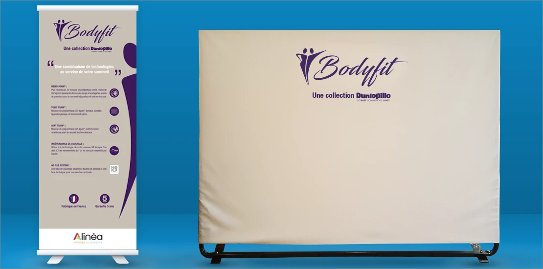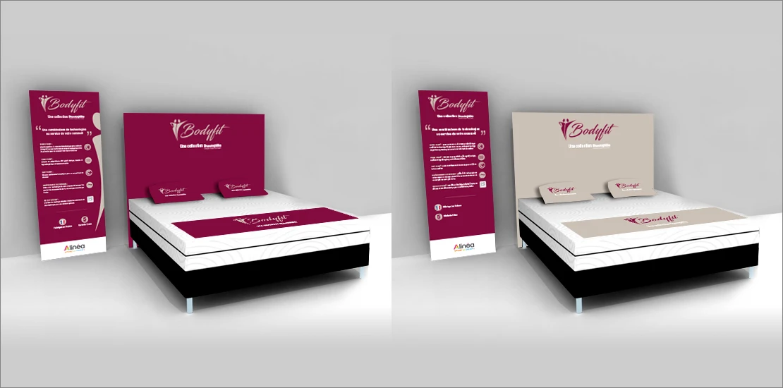 A partir du brief client : exprimer le bien être de dormir sur des produits Bodyfit, création du logo et déclinaison de la communication (kakémono, tête de lit et aménagement pour showroom).