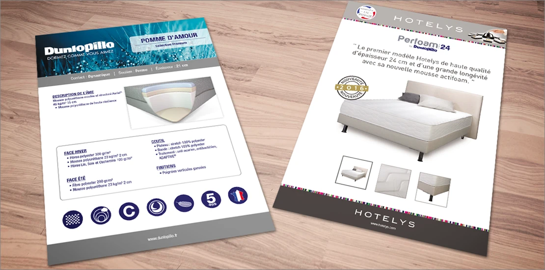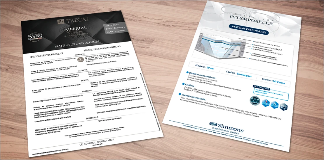 Pour les marques Treca, Simmons, Dunlopillo et Hotelys, en respectant les chartes graphiques de chaque marque, création de fiches produits types pour les sites internet.