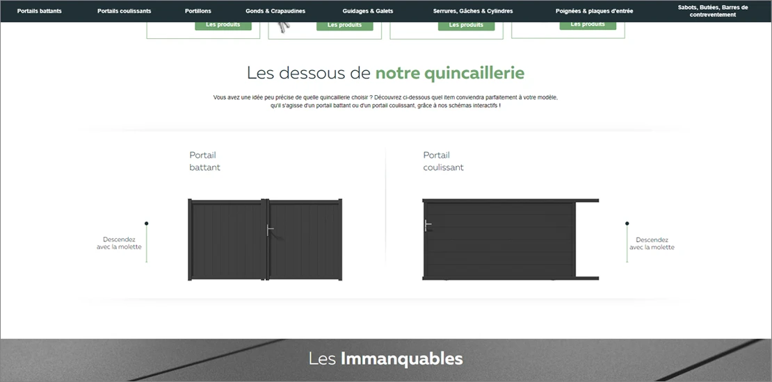 Développement d’un carrousel interactif au scroll de la souris, permettant d’expliquer visuellement l’emplacement des quincailleries sur un portillon, un portail battant ou coulissant.