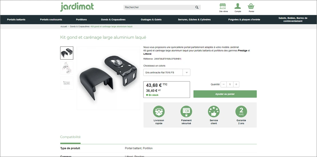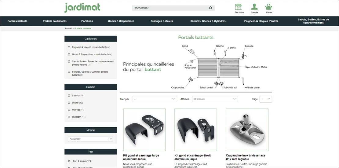 – Création du site e-commerce de quincailleries pour les portails alu des gammes Classic, Variation², Littoral, Prestige de la marque Jardimat
